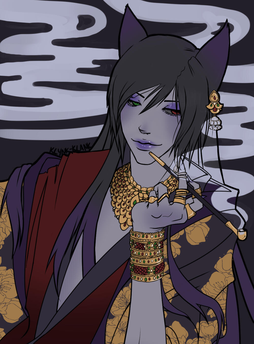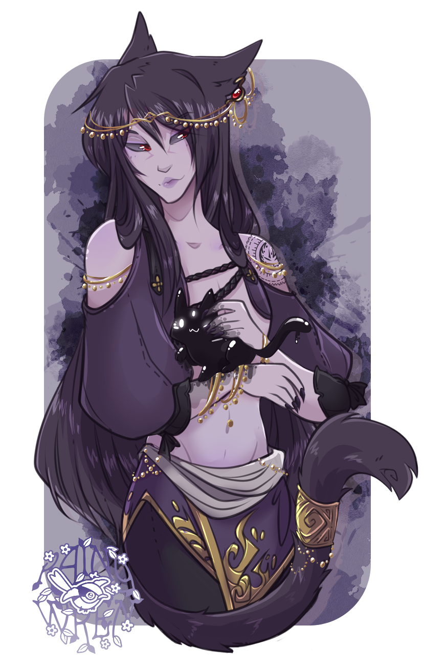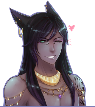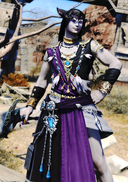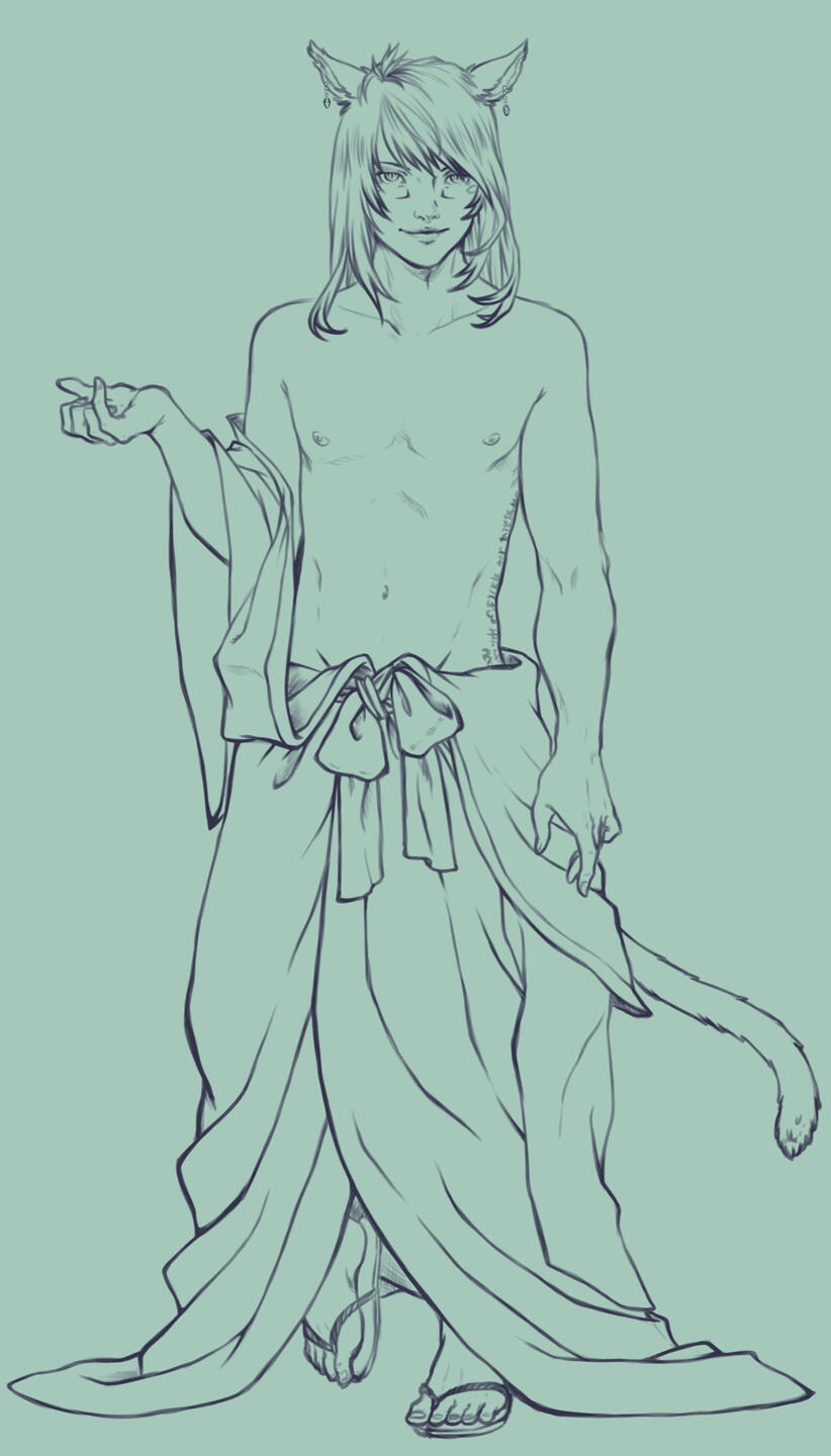 The clinking sound of golden charms can be heard whenever this miqo'te approaches, and it lingers after he departs. In his presence, the soft scent of mingled lavender and smoke suggest he's only just quit one of his two favorite pursuits: spellcraft or alchemy. Magick, though, is never far when he is near. In the heat of the desert sun, the air about him is an oasis of cool comfort; in the rain, water steams from his skin; and in the cold, he exudes an aura of heat.